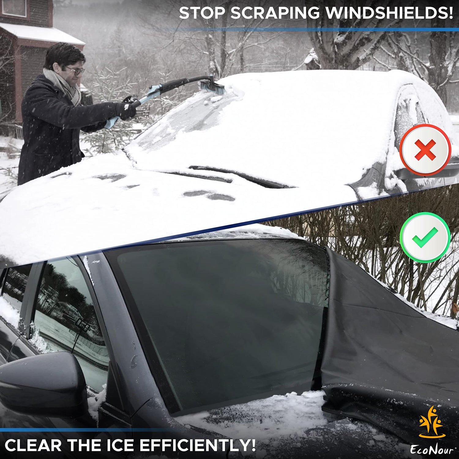 EcoNour's car windshield snow covers protect against all snow-related damages, like frosts, hail, blizzards, sleets, and snowstorms as well.