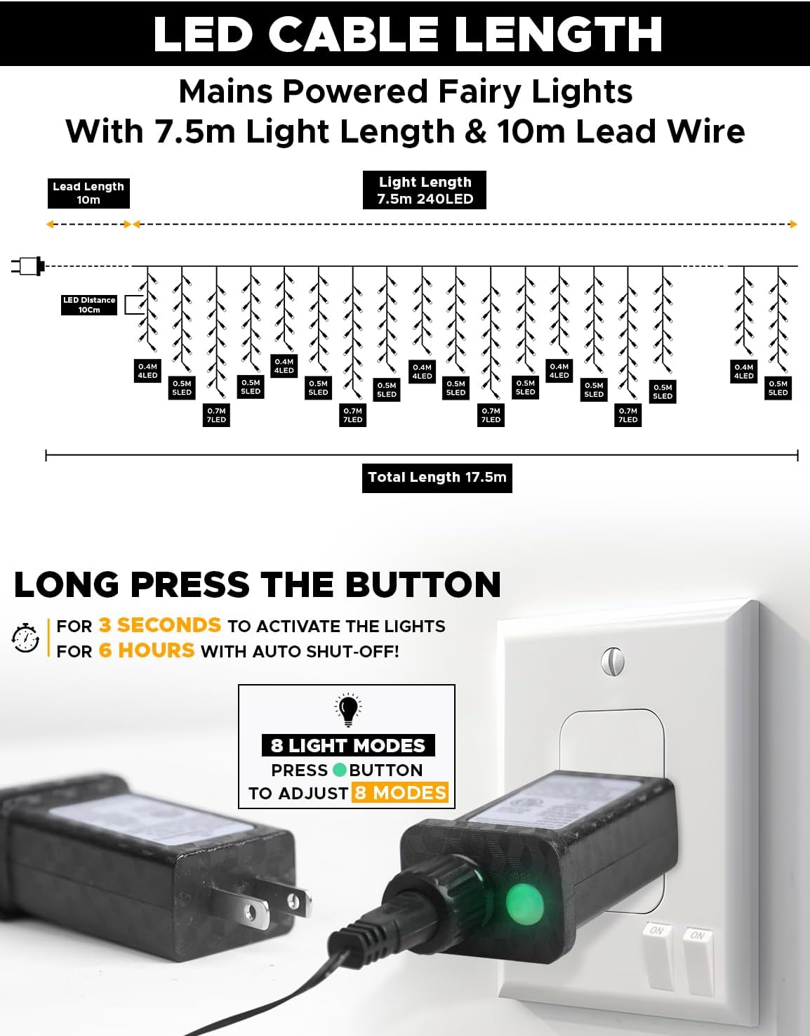 Christmas Icicle Lights Outdoor – EcoNour 240 LED Cool White Lights